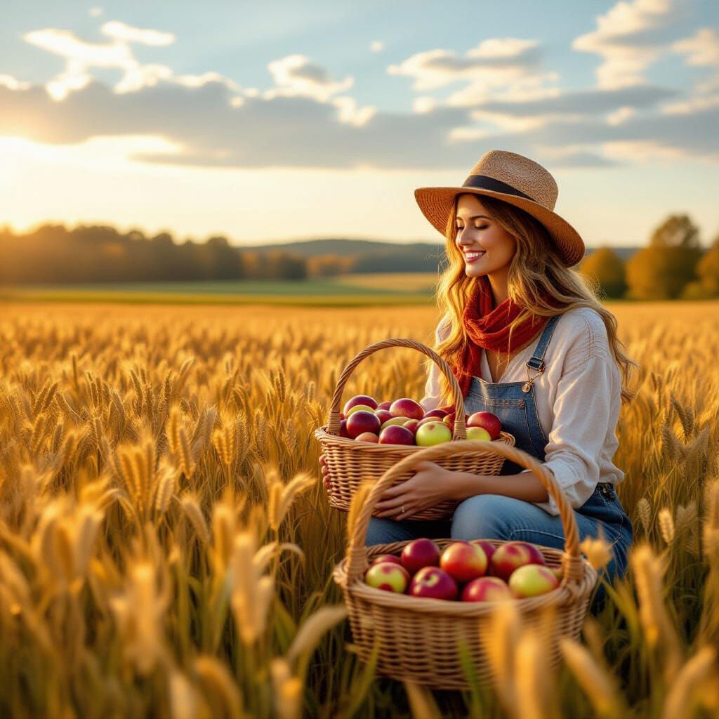 This image captures the bountiful harvest of autumn, showcasing fields of grain, overflowing orchards with apples, and gardens offering their final produce before winter's arrival.