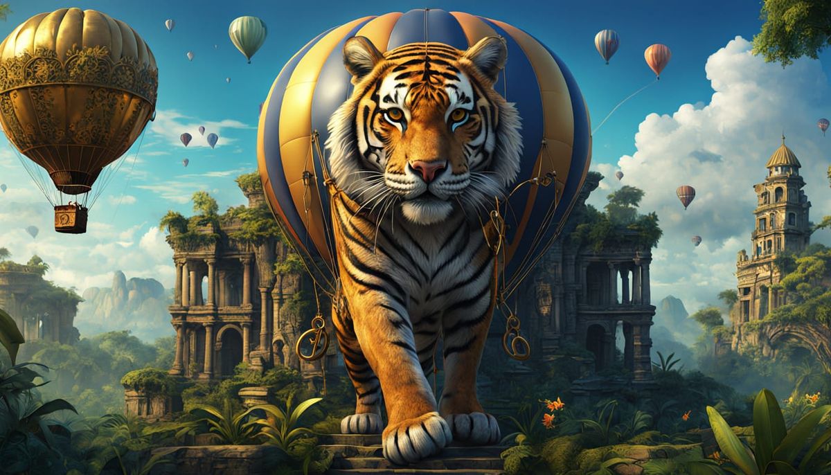 A whimsical image depicts a tiger wearing a monocle piloting a Victorian-era hot air balloon above rainforest ruins. The digital painting features vibrant colors and intricate details, as 3D rendered digital art.