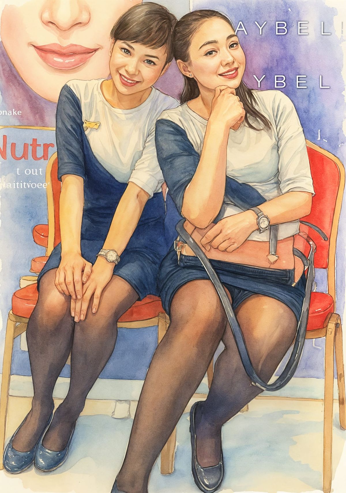 This image shows two women in pantyhose tights. The artwork is rendered in a watercolor painting style, with soft lines and blended colors.