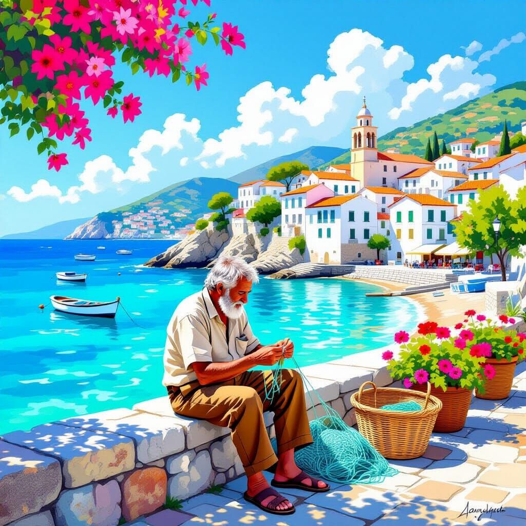 This image shows an elderly man mending fishing nets on a stone ledge overlooking a vibrant Mediterranean coast. Painted in a loose watercolor style with expressive brushstrokes.