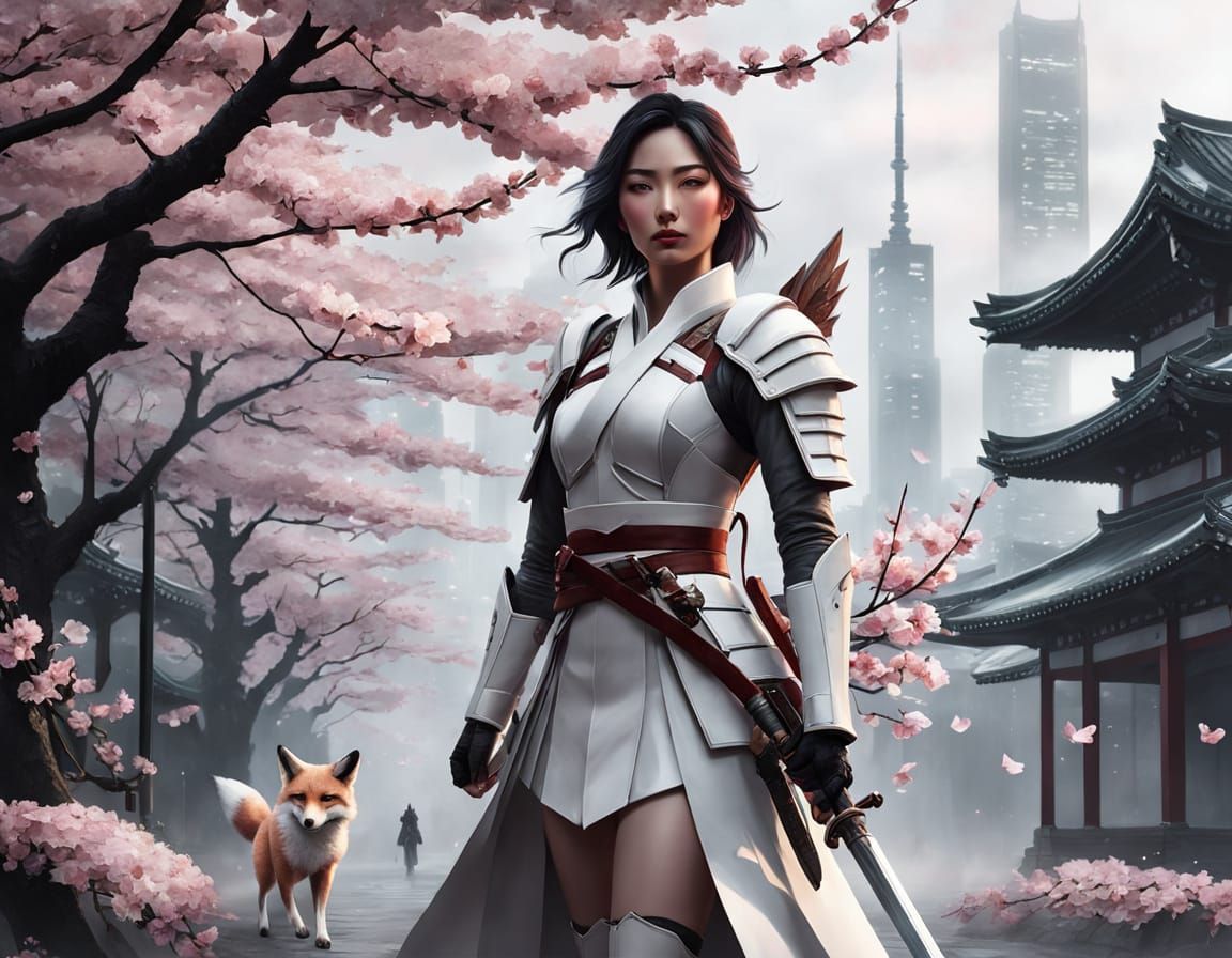 A hyperrealistic digital painting depicting a paper girl and fox amidst falling cherry blossoms. Features a fallen angel warrior with wings, set against a greyscale cyberpunk city in a soft sunrise glow. Rendered in an impasto oil painting style with delicate paper textures.