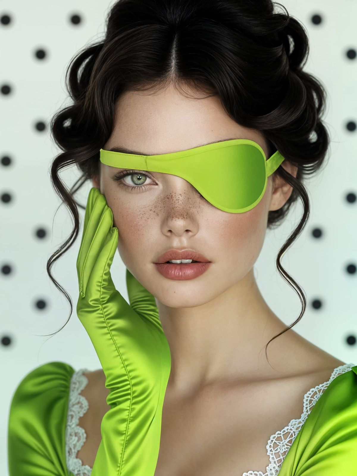 This photorealistic image features a beautiful young woman with black hair, wearing a lime green dress and gloves, gently touching a matching eyepatch. Subtle divine glow and delicate textures enhance the portrait.