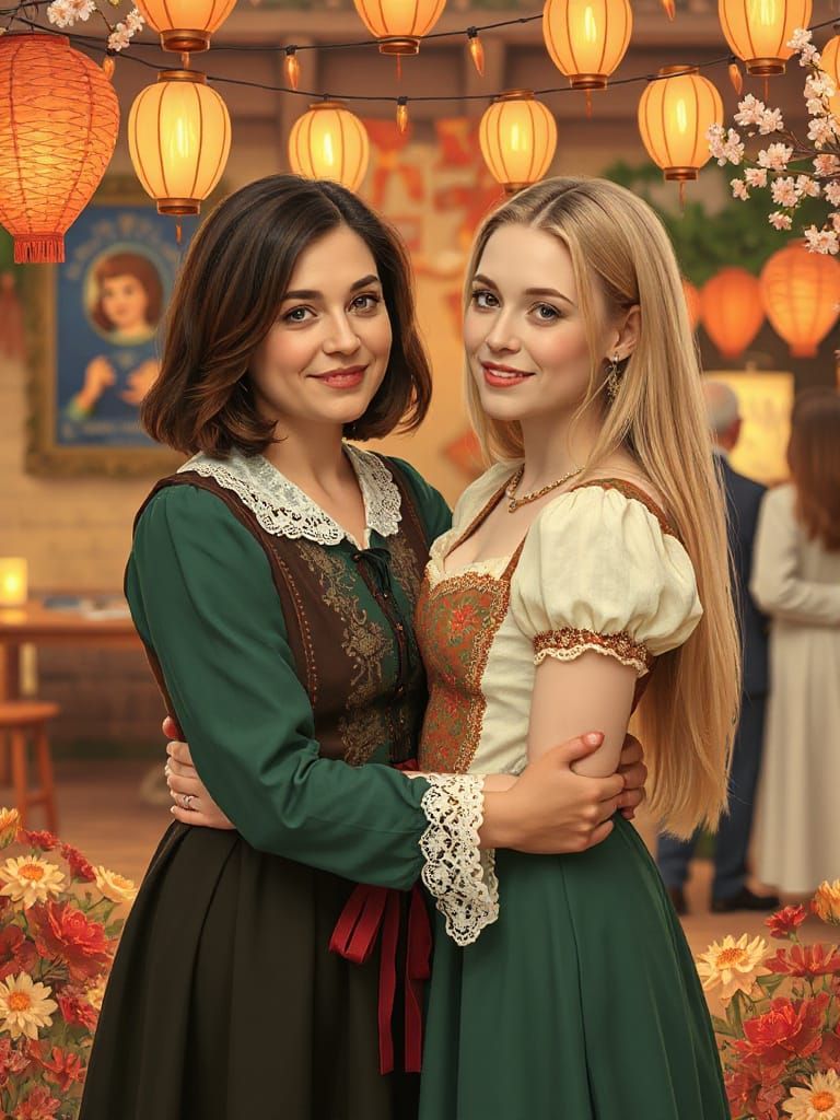 This image shows two women in traditional folk costumes embracing at a vibrant festival. Warm lanterns and blooming flowers surround them in a whimsical, romantic style with elegant lines and warm colors.