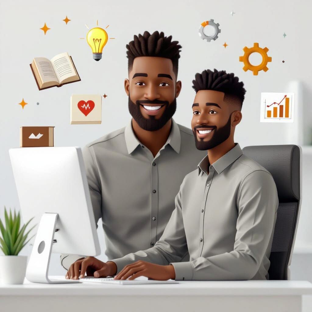 This image shows a strong, brown-skinned individual in a collared shirt sitting at an office desk. Floating minimalist icons surround them in a bright, clean palette, rendered with subtle 3D effects.