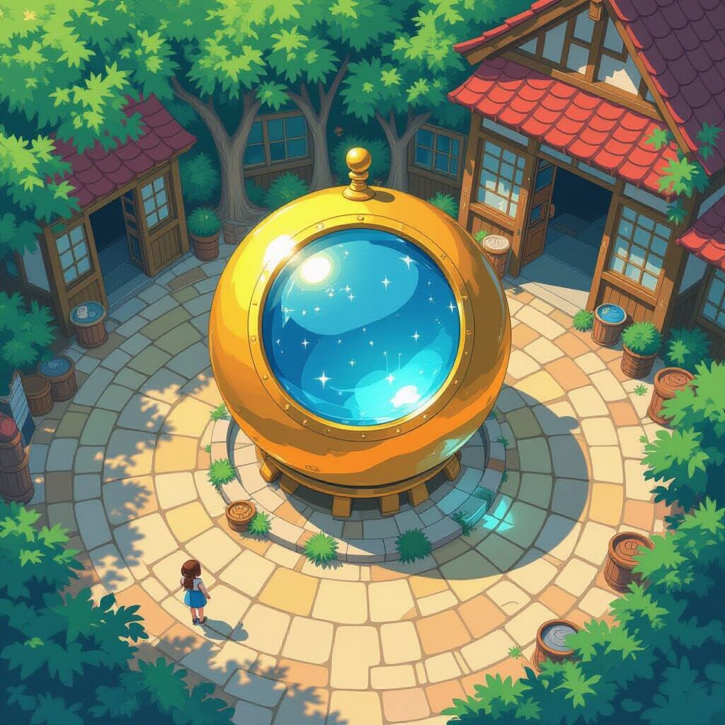 A digital artwork shows a top-down view of a golden sphere encasing a sapphire. The image is rendered in a Studio Ghibli animation style, with dreamy, pastoral colors and soft, bright tones.