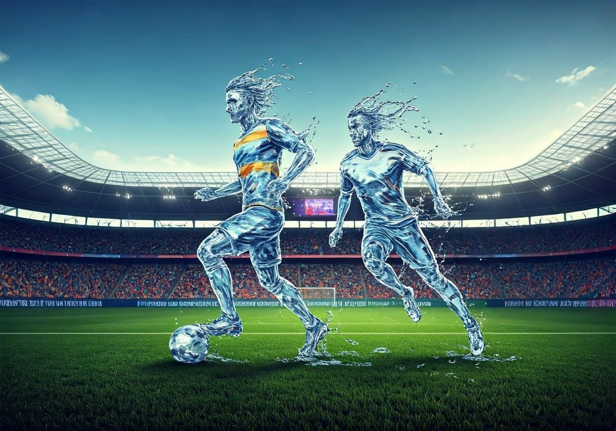 This image shows soccer players made of water frozen in dynamic poses on a vibrant green field. The style evokes elements of watercolor, futuristic concept art, and surrealist painting.