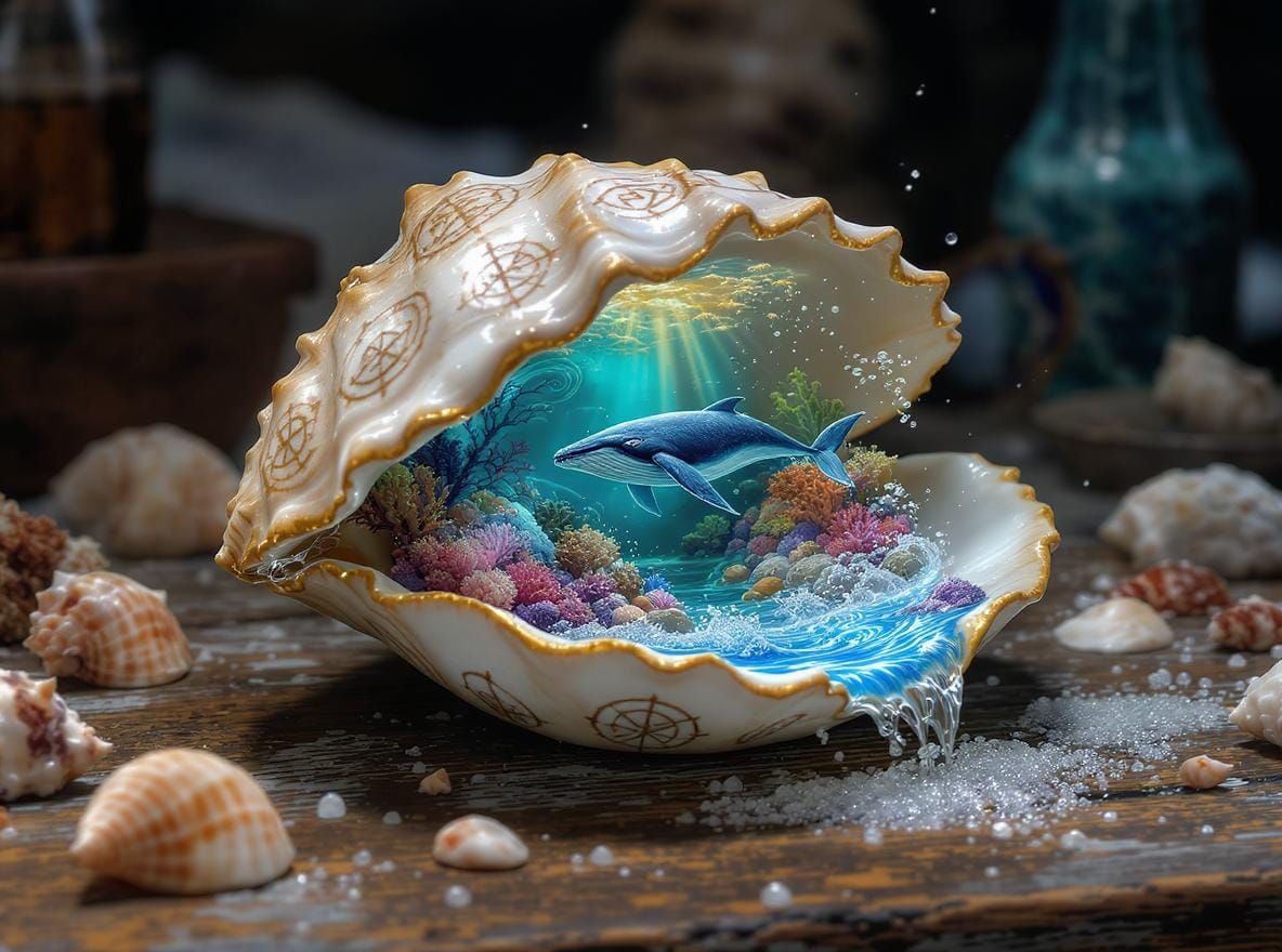 A detailed fantasy image shows an antique seashell with a miniature underwater kingdom inside. Coral reefs, a whale, and nautical symbols are visible in this digital art piece with dramatic lighting.