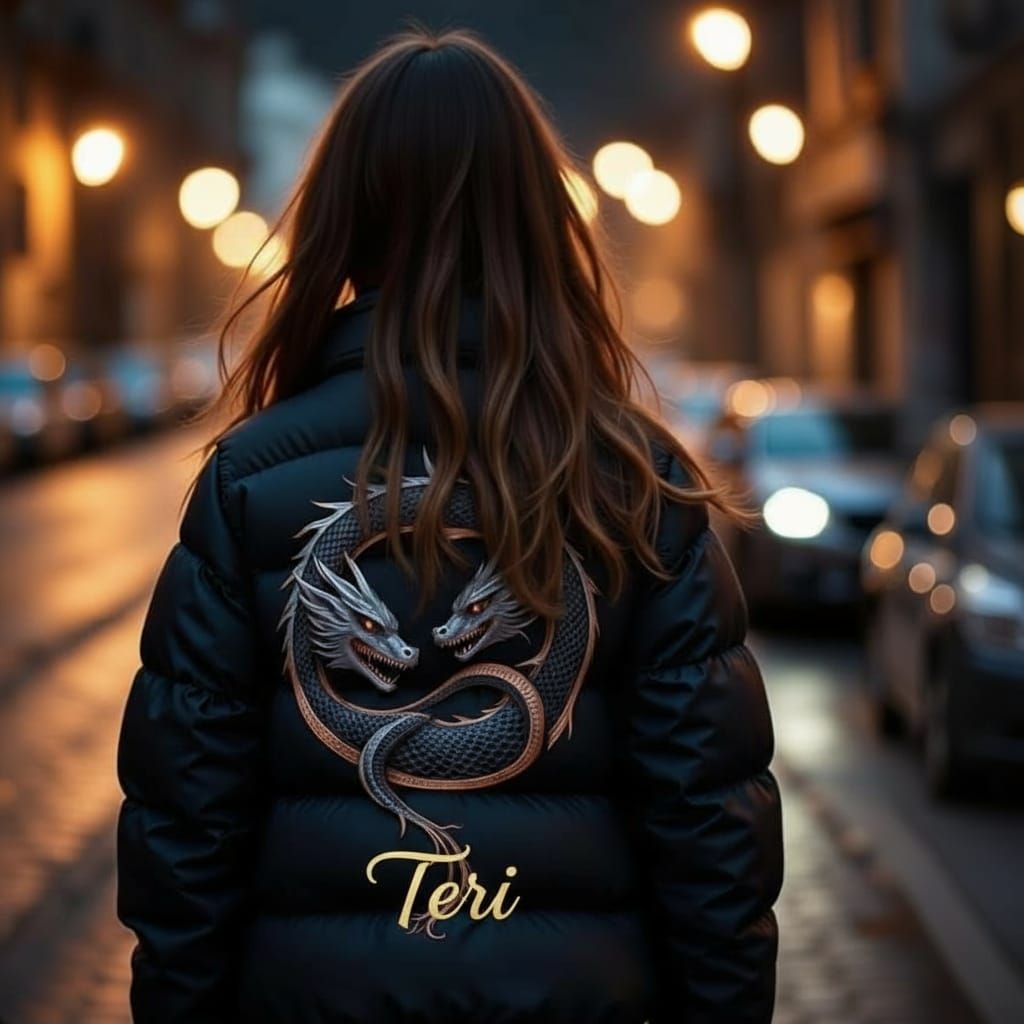 This image shows a woman from behind, wearing a hooded black jacket at night. A black and white dragon yin yang design is visible on the back of the jacket, illuminated by streetlights.