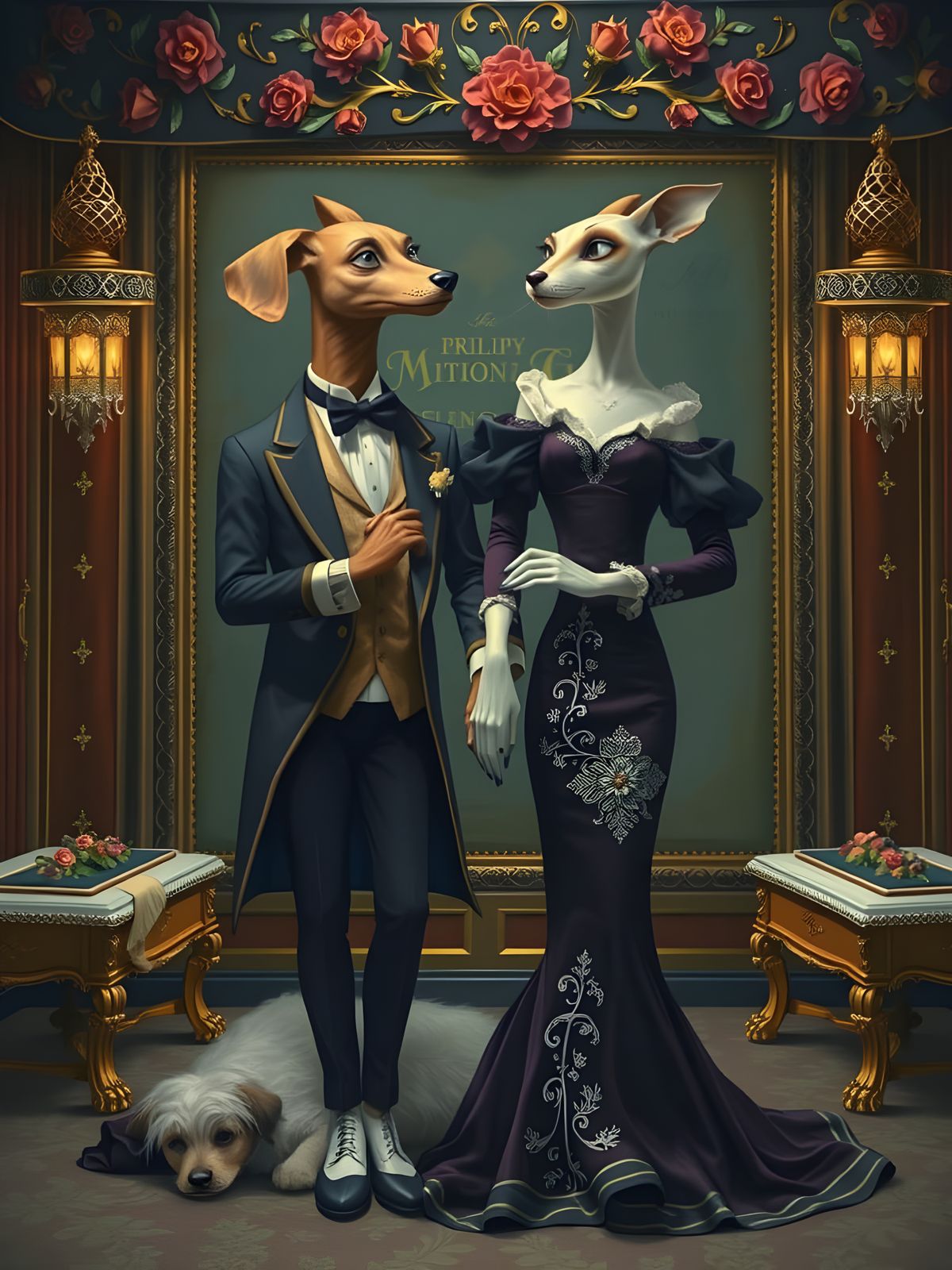 This image shows a dog-man and cat-woman duo, both with elongated necks, dressed in formal attire, standing proudly on a stage in a whimsical, Tim Burton-inspired scene.