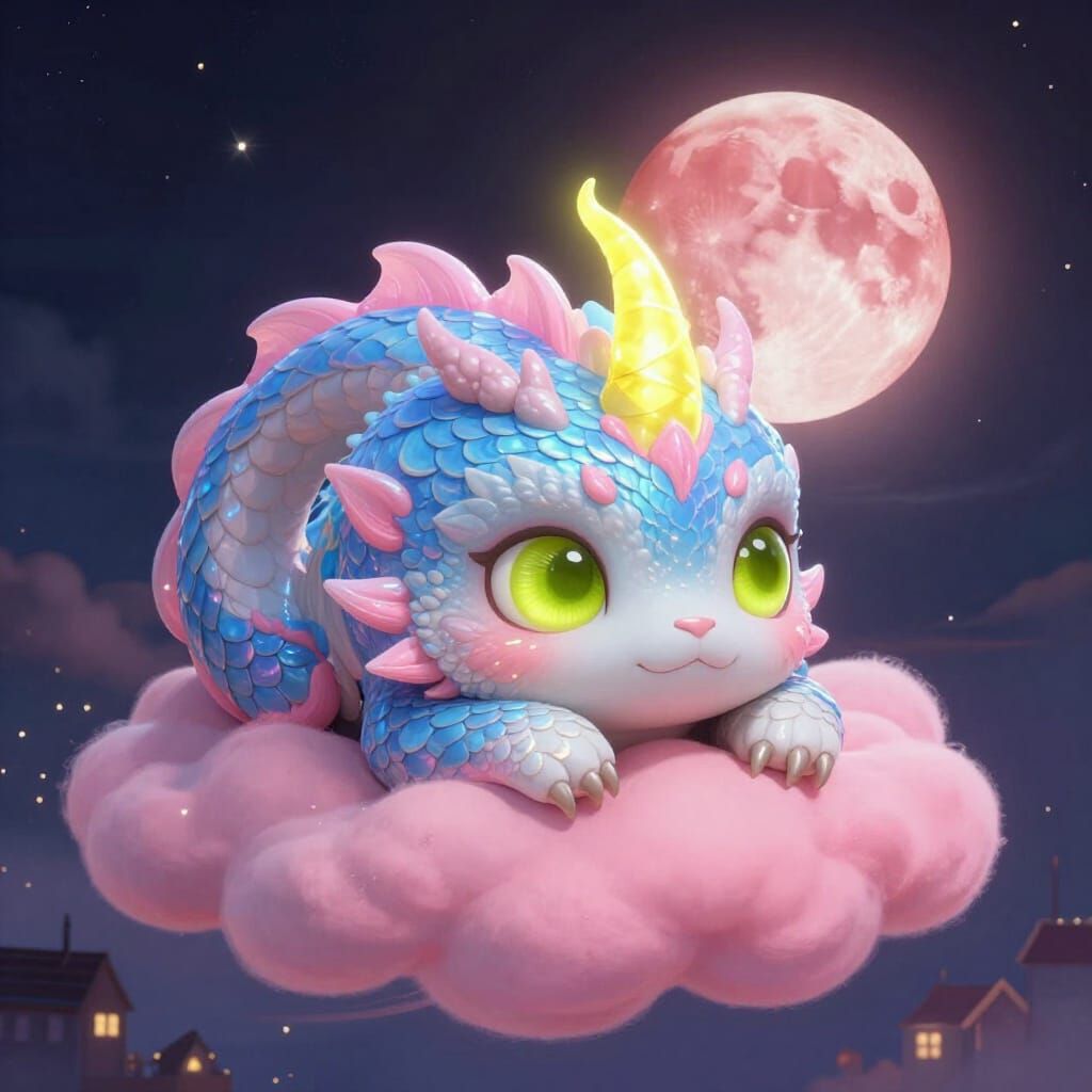 This whimsical image features a fantastical creature with iridescent scales and puppy-dog eyes resting on a pink cloud. A blood moon casts an eerie glow over a twinkling town below, rendered in a dreamlike, painterly style.