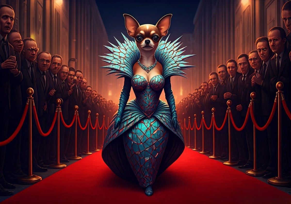 A 3D caricature of a regal Chihuahua in haute couture, surrounded by mindless fans, rendered in bold lines and acidic colors, with scathing social commentary and biting humor