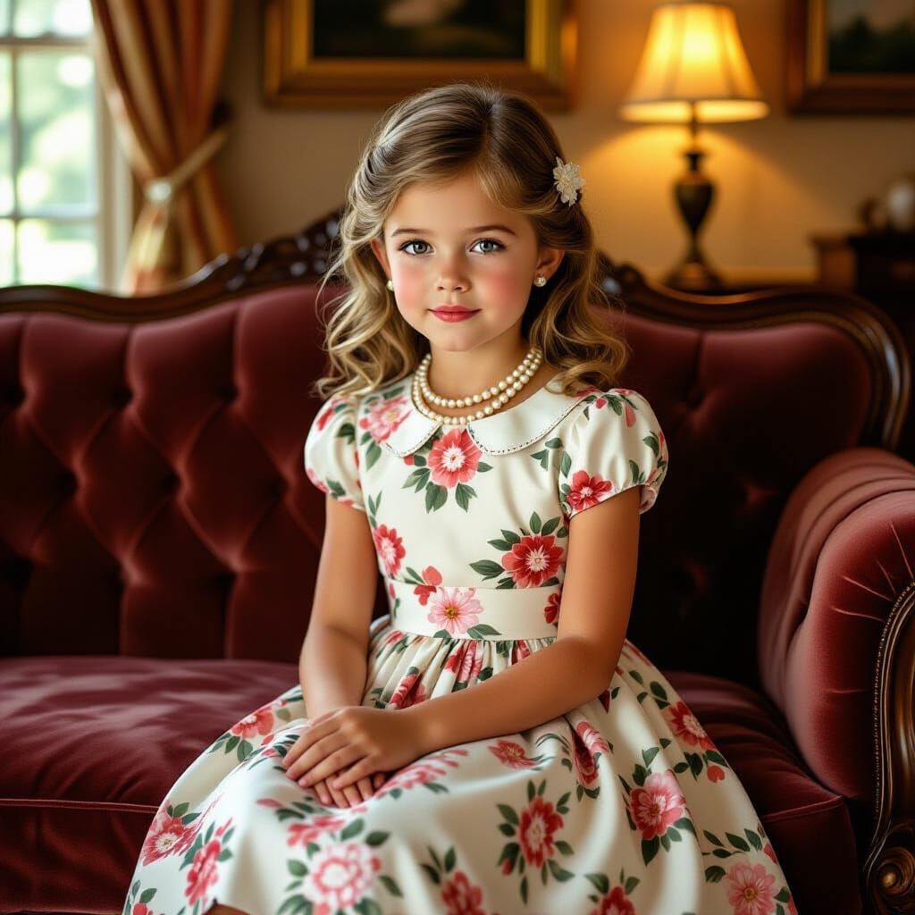 A young girl in a floral dress and pearls poses in a nostalgic vintage living room. The image evokes warmth and delicate detail, reminiscent of classic illustration and painting styles.