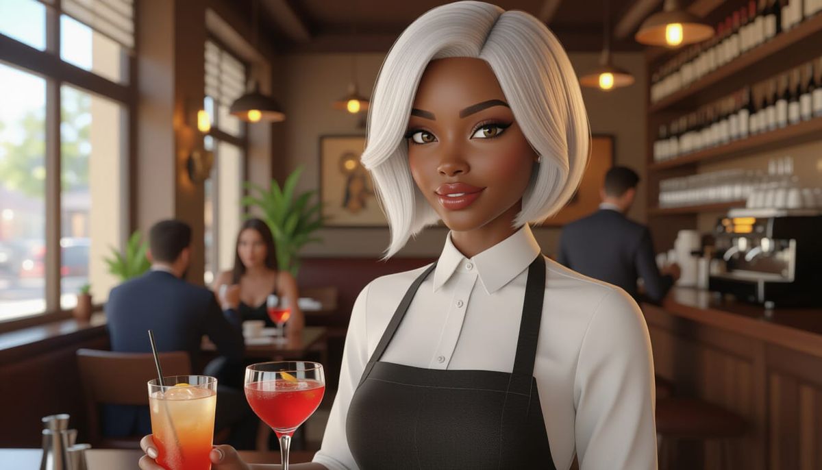 This image depicts a beautiful Black woman with white bob hair, dressed as a waiter, serving drinks in a lively restaurant. Rendered with dramatic lighting and a vibrant palette.
