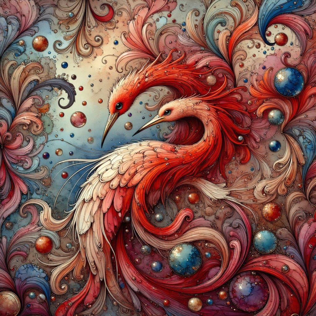 This image shows a reddish egret with fiery plumage standing gracefully in a wetland setting. The artwork evokes the style of naturalist illustrations with painterly brushstrokes and an ethereal quality.