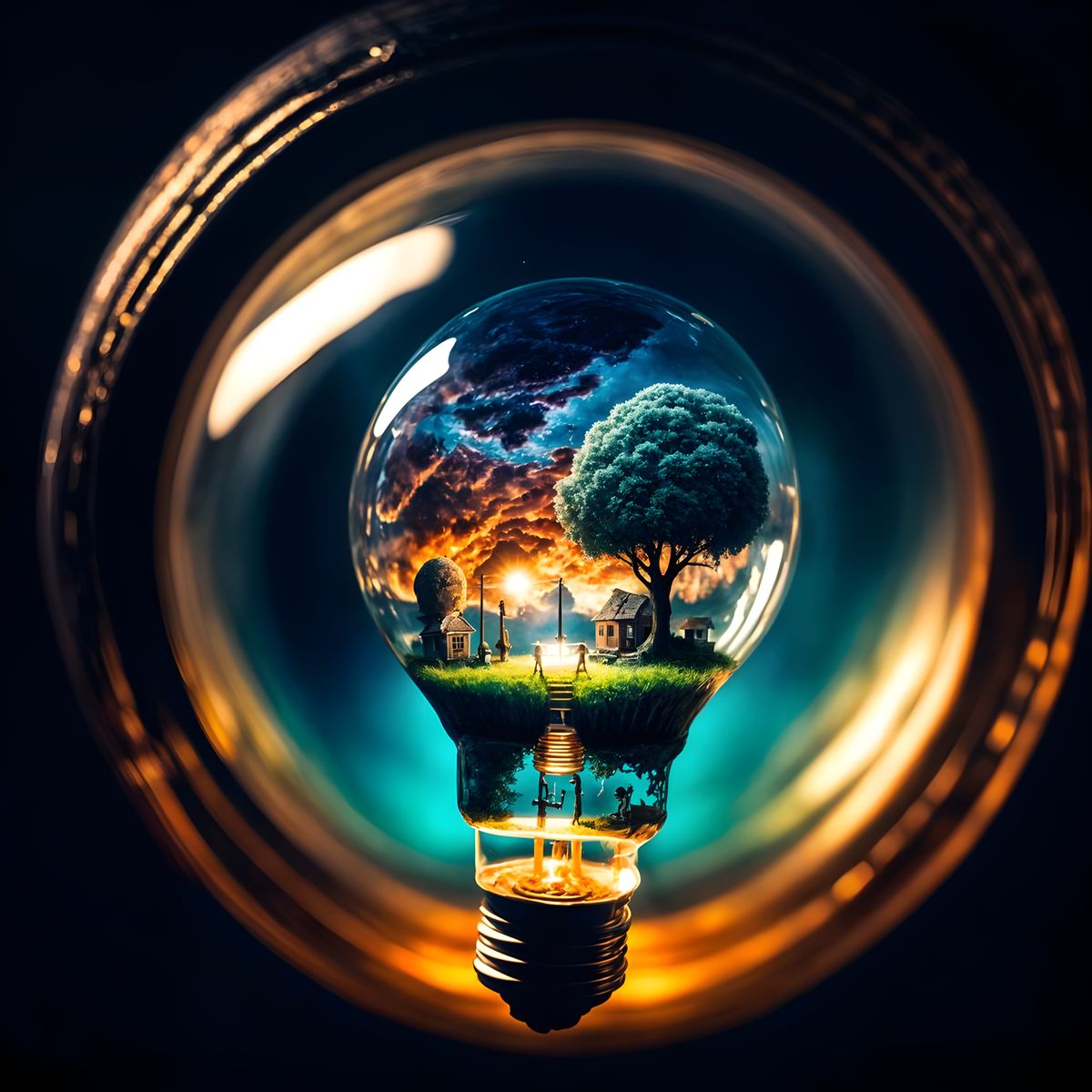 This image shows a world contained within a lightbulb, rendered in charcoal. The artwork evokes a sense of fragility and the preciousness of the world.