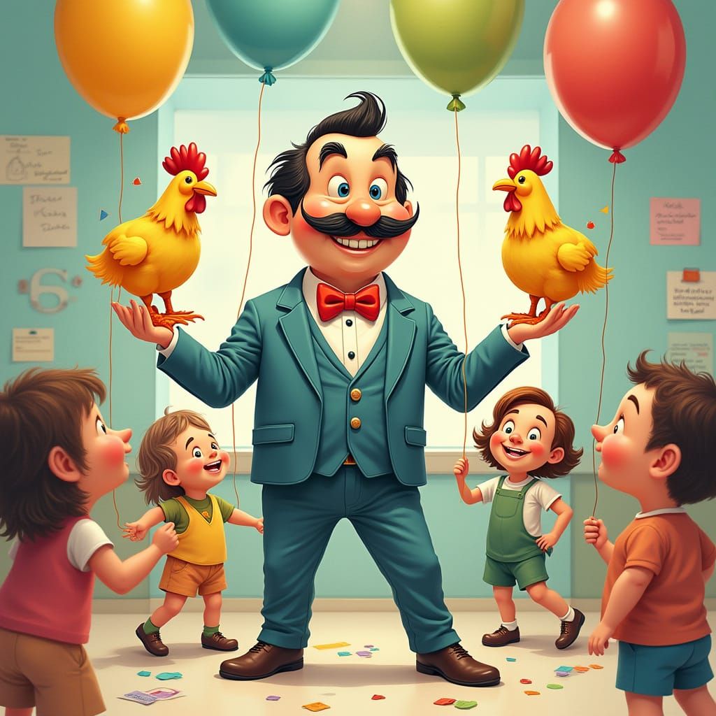 A whimsical illustration of a charming young man entertaining sick children with rubber chickens and silly faces in a colorful hospital setting, blending the styles of Norman Rockwell and Quentin Blake.