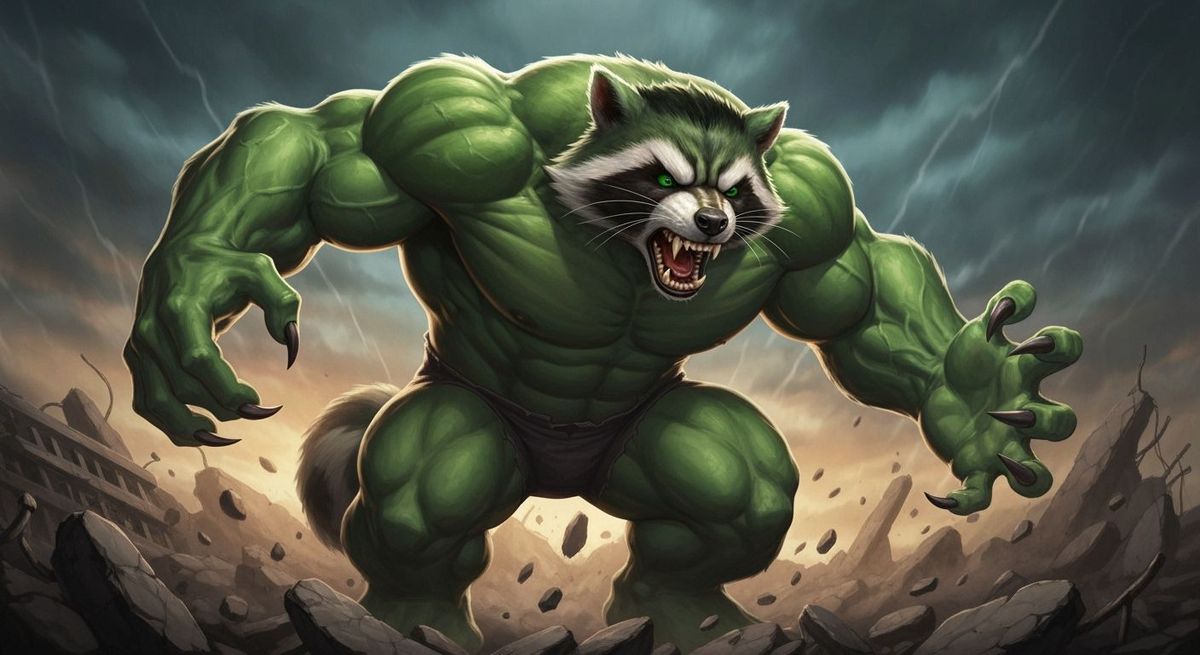 This image shows a giant, muscular, green raccoon. The comical artwork depicts the animal in a superhero style, reminiscent of a well-known comic book character.