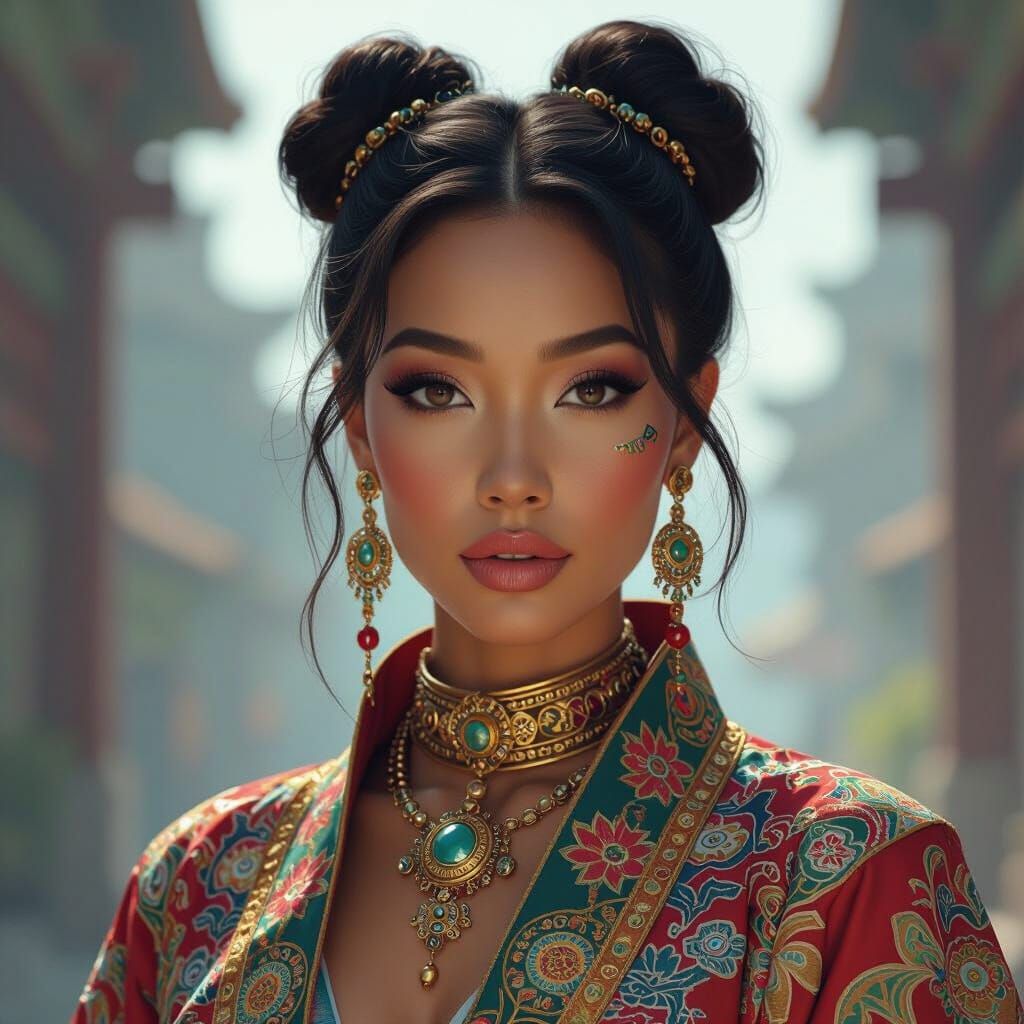 This image showcases a stunning woman with mixed brown skin, adorned in intricately patterned, vibrant attire and ornate, futuristic jewelry, created with deep, rich colors and a fantasy concept art style.