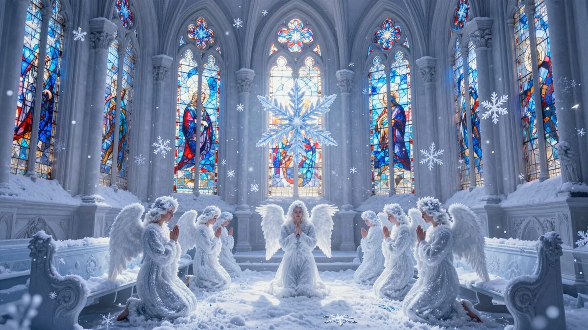 This image depicts a grand cathedral made of snowflakes, featuring stained-glass windows of ice casting prismatic light. Angels with snowflake wings are shown in prayer, set in a dreamlike, luminous style.