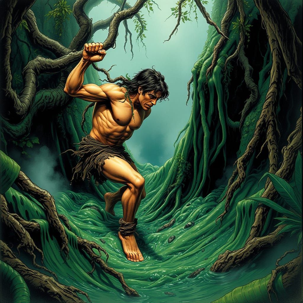 A muscular figure, clad in vines and a tattered loincloth, battles to escape a thick, green slime pit, surrounded by twisted roots and jungle foliage, in a dynamic, surreal landscape
