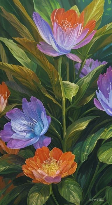 This image shows fantasy plants with human-like characteristics in a vibrant, lush forest setting. The scene is bathed in soft, warm light, creating a cinematic and dreamlike atmosphere in an oil painting style.