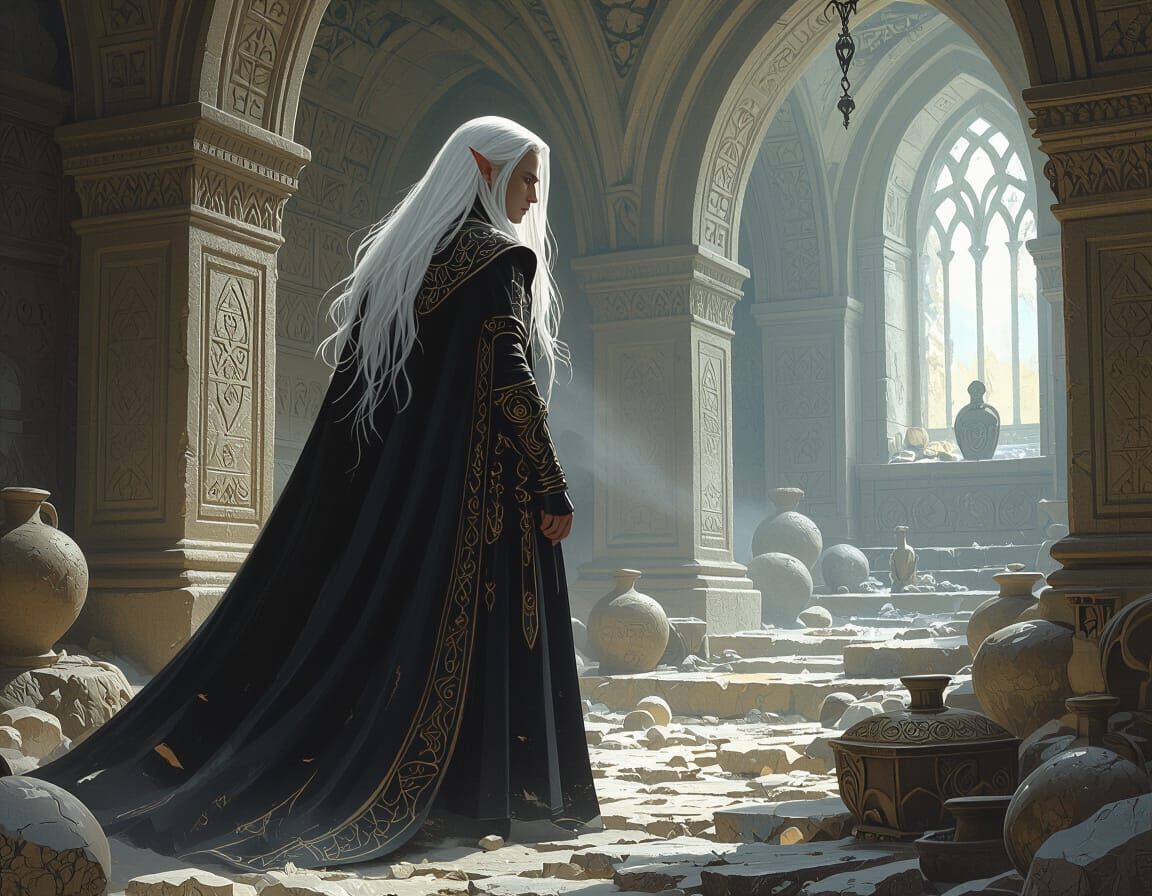 This image shows a male elf with long white hair in a crypt. The elf, clad in a black cloak, searches for treasure among relics and artifacts in a dramatic, cinematic style.