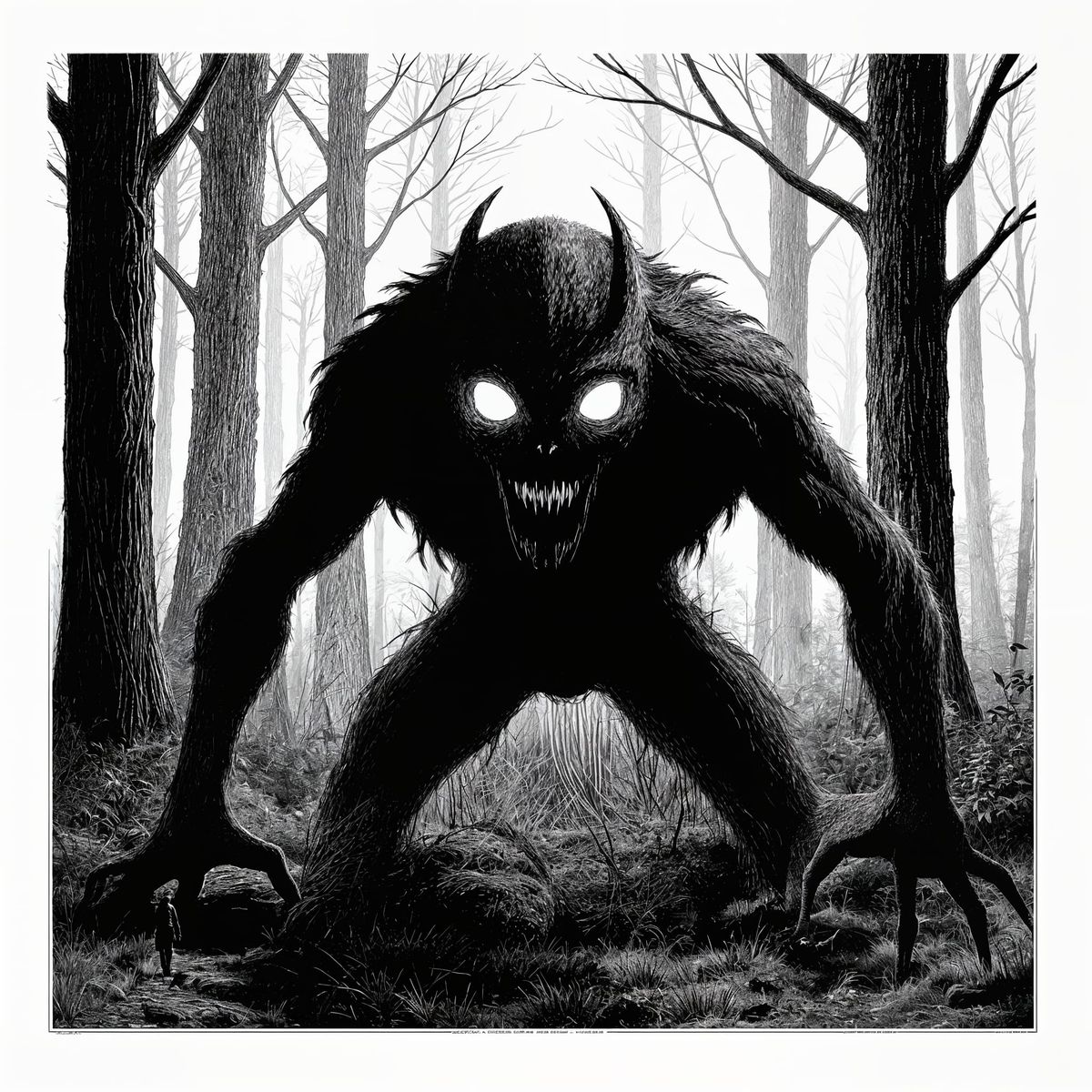 A striking picture of a shadowy cryptid with glowing eyes lurking in a forest. The black and white image evokes a retro lithograph aesthetic with mechanical dot shading and dramatic detail.