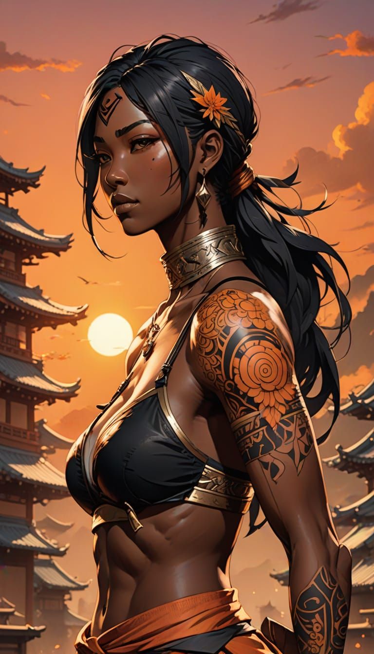 This image showcases a confident and powerful Black warrior in a vibrant, anime-inspired setting. Detailed tattoos, tribal accessories, and a dynamic pose come together in a bold and colorful illustration, reminiscent of Japanese Manga style.