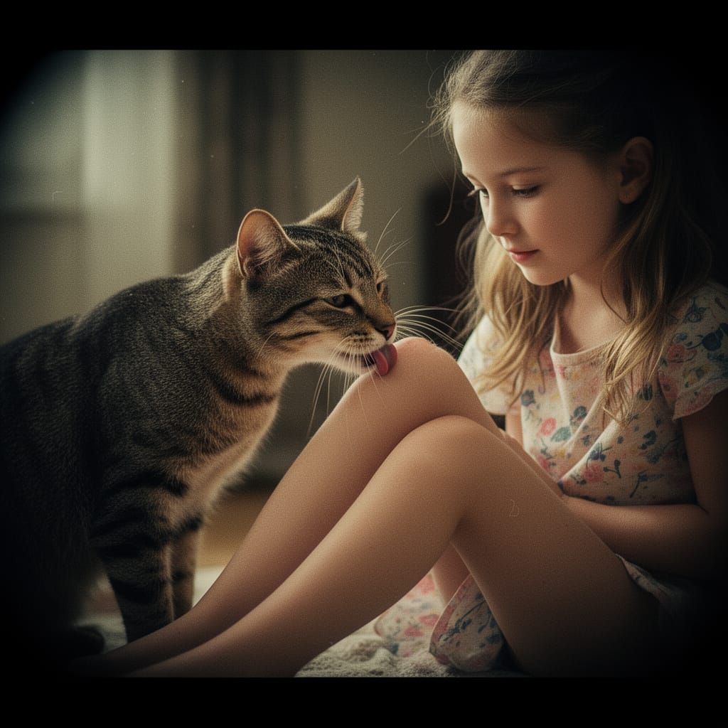 A dramatic cinematic film still captures a cat gently licking a young girl's leg. Shot with film grain and atmospheric lighting, this image evokes a sense of tender realism.