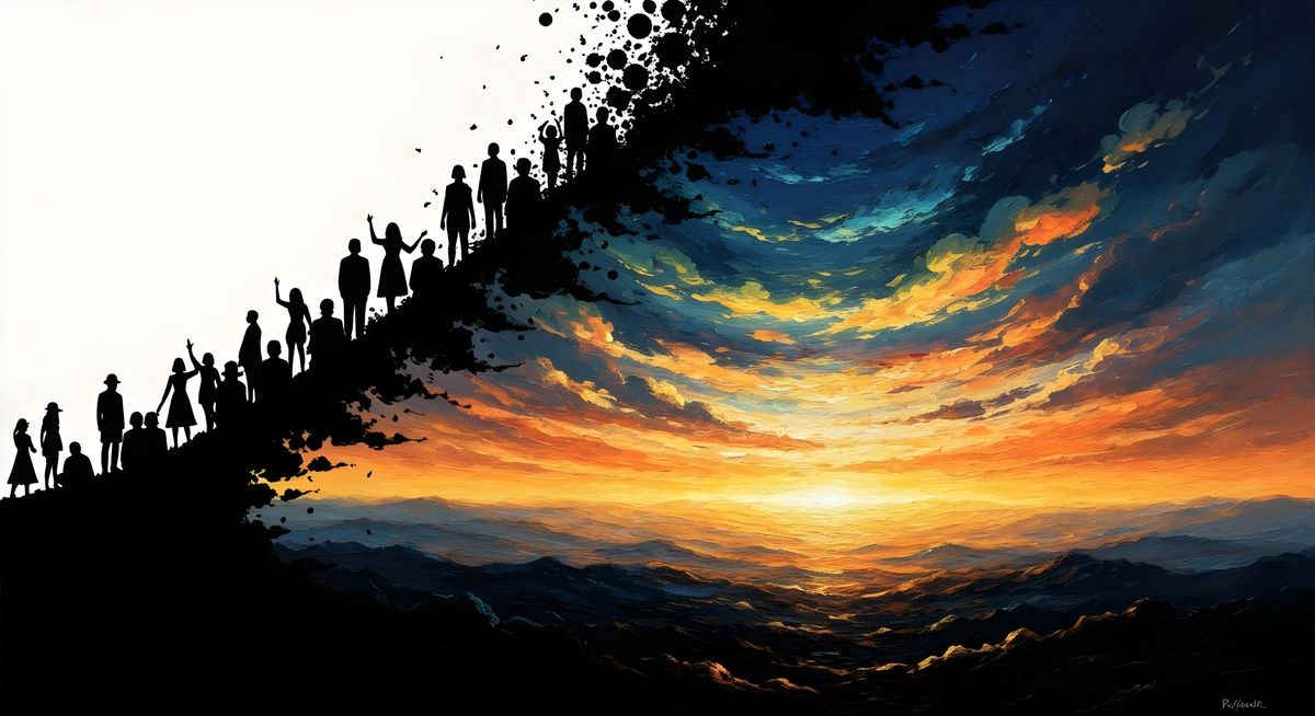 This abstract art features black silhouettes of people merging into colorful clouds, with a dramatic night landscape illuminated by warm horizon light.