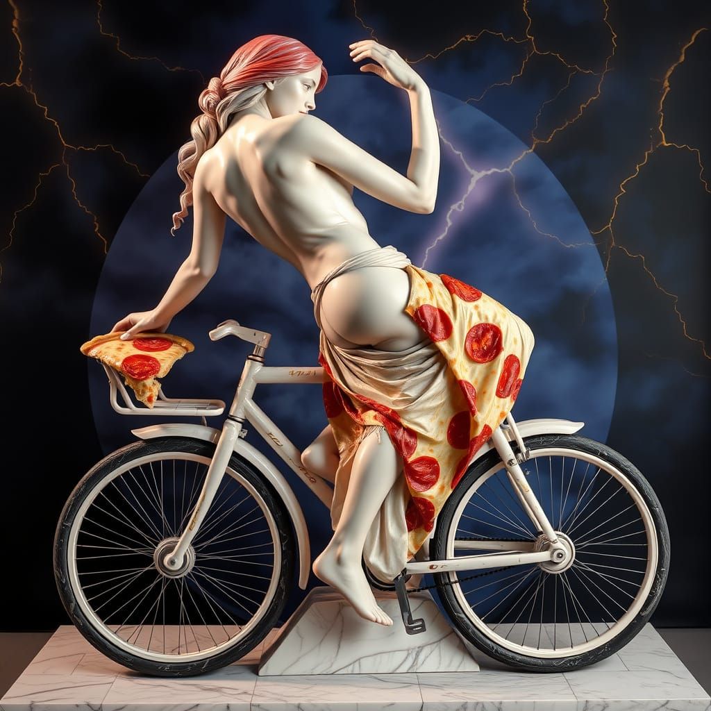 This image shows a larger-than-life marble sculpture of a captivating woman, her form hewn from rainbow calcite and blush onyx, lounging on a bicycle carved from Carrara white marble, adorned with a bas-relief pizza motif in smoldering carnelian and gold-veined Sienna marble, with dynamic lines and mater...