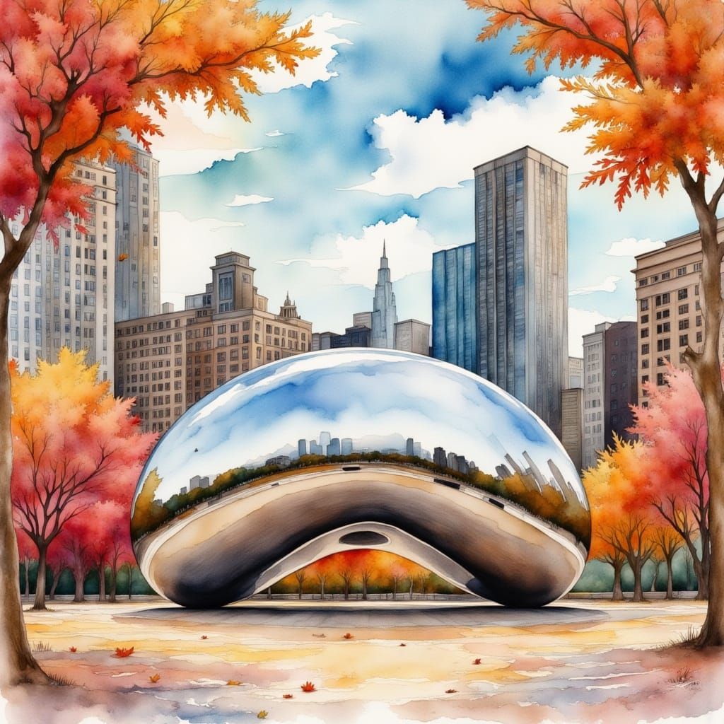 A vibrant watercolor painting captures the iconic Chicago Bean in Millennium Park during autumn. Reflective surfaces show a crisp sky and colorful fall foliage, rendered with textured washes.