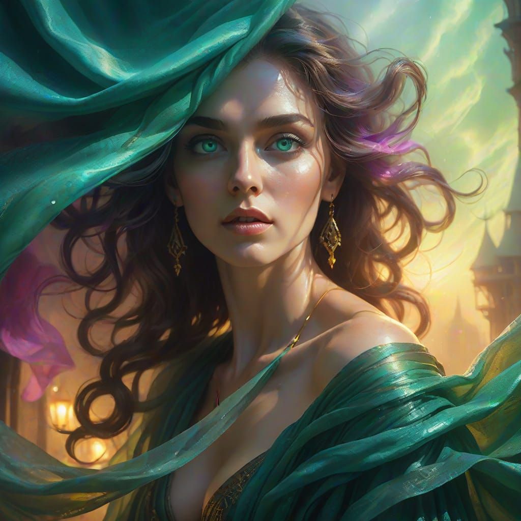 This captivating digital painting features a mysterious woman with hypnotic green eyes, partially hidden behind sheer emerald fabric, set against a swirling misty background. Inspired by the dramatic lighting of Rembrandt and the dreamy quality of Thomas Kinkade, this artwork combines vivid colors, intri...