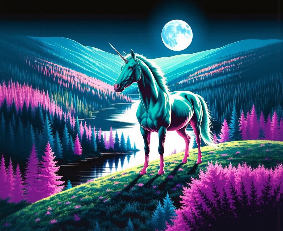 A striking picture of a green unicorn on a hillside under moonlight. The fantasy landscape includes forests and lakes, rendered with vivid colors and complementary light and shadow.