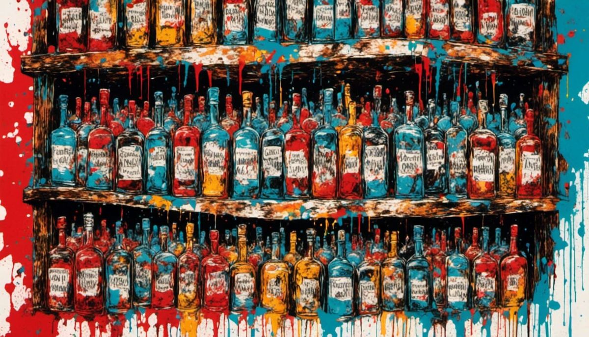 This image shows a tequila bottle displayed on a bar shelf. The artwork features tetradic colors and evokes the style of modern European ink painting, with macabre and splatter graffiti influences.