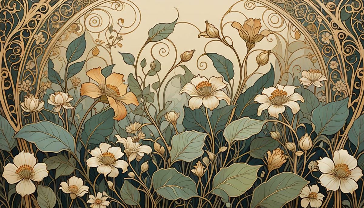 This image features a dreamy, soft-focus illustration of organic foliage in an art nouveau style, with intricate, flowing curves and ornate details, set against a warm, muted color palette with touches of gold and earthy tones.