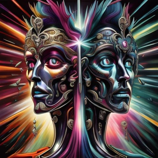 This image shows a striking double portrait rendered with tinted metallic and prismatic effects, evoking a dark and whimsical artistic style.