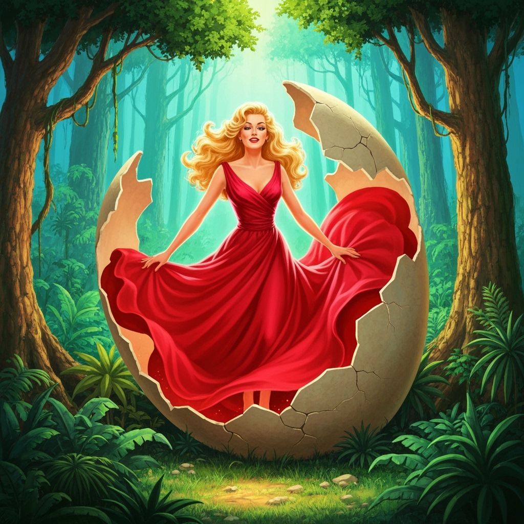 This image shows a blonde woman in a red dress emerging from a dinosaur egg. The scene depicts a vibrant Jurassic forest with dramatic lighting, in a fantasy art style.