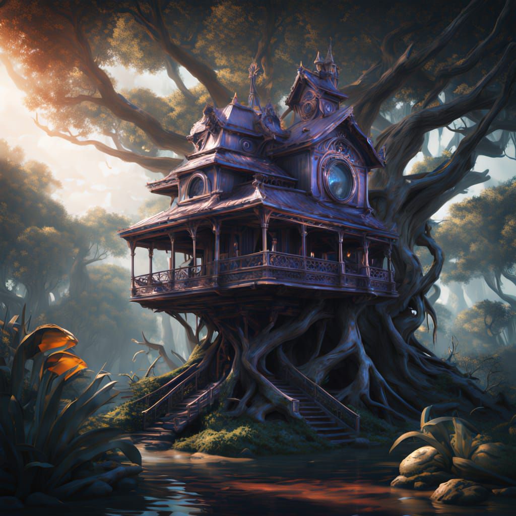 A digital artwork of a whimsical birdhouse made of driftwood and seashells, nestled in mangrove roots. The image, in a surreal style, captures the tranquil swamp in the warm light of sunset.