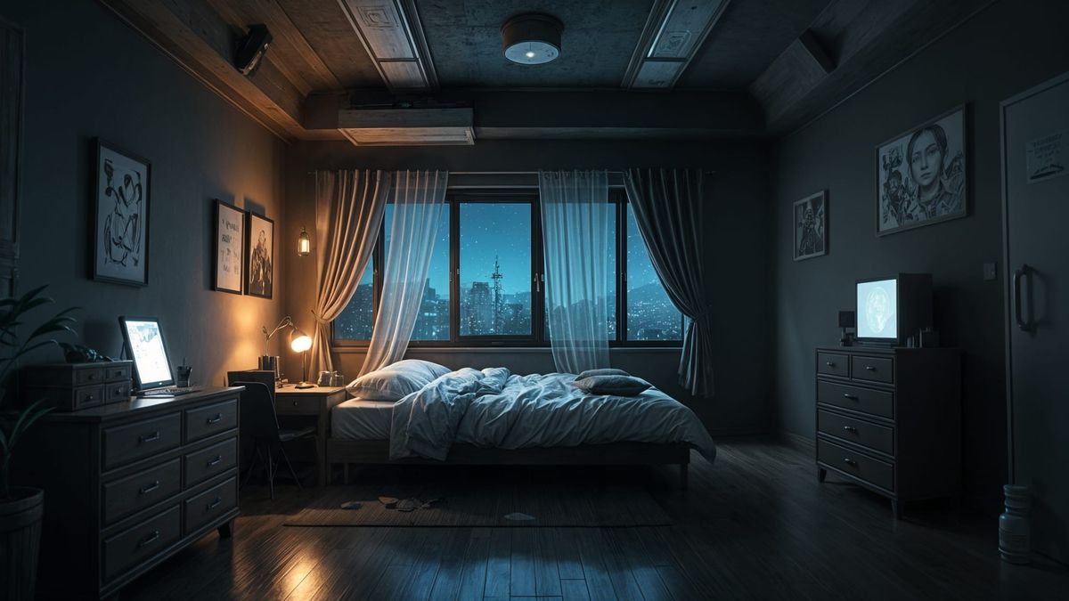 This image shows a breathtakingly detailed 3D anime art depiction of a military bedroom at night, created with ultrafine detail and inspired by the aesthetic of concept art and 8k resolution renderings.