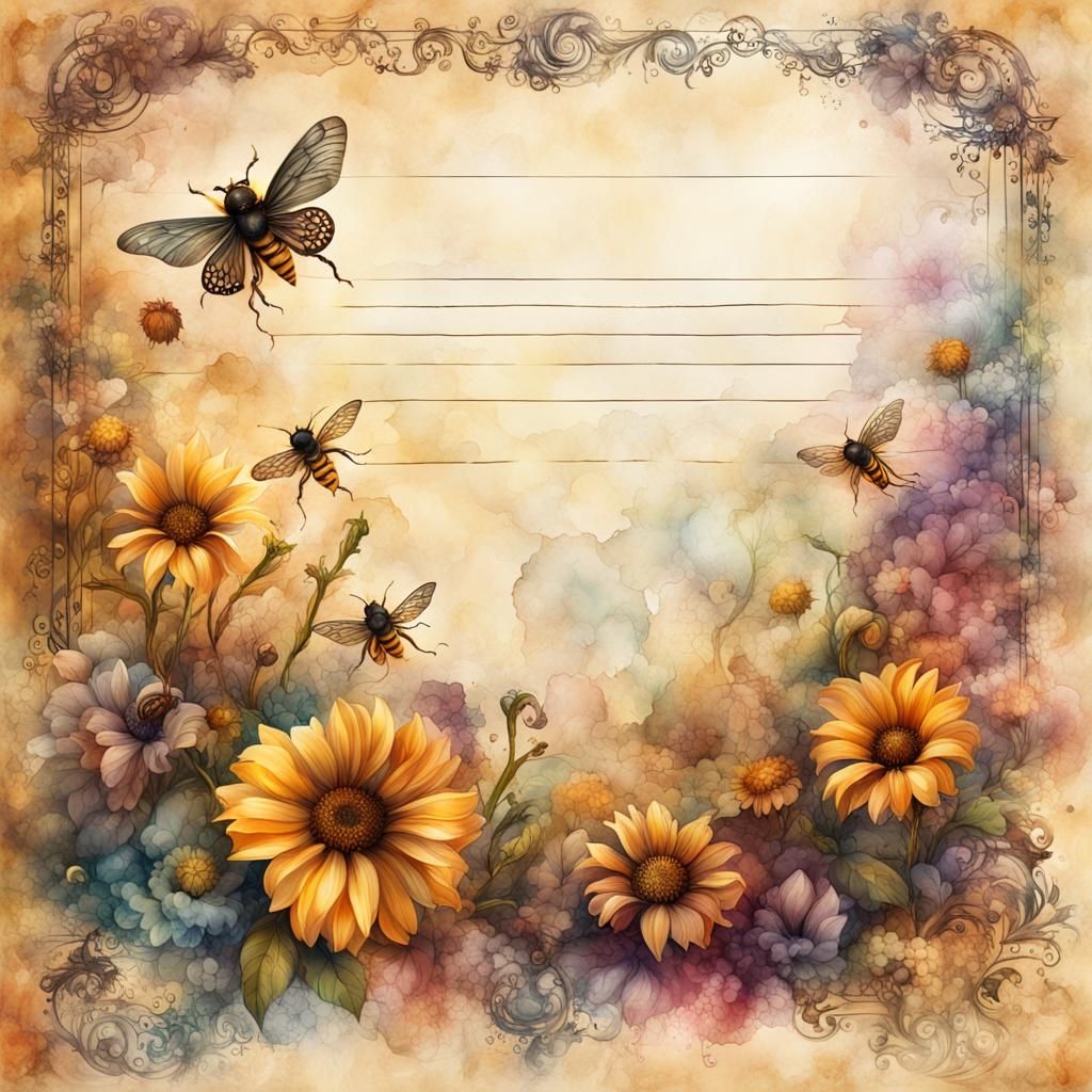 This image depicts a lined notebook page background. The bottom border features flowers, bees, and musical notes in a vintage watercolor and ink style with cosmic elements.