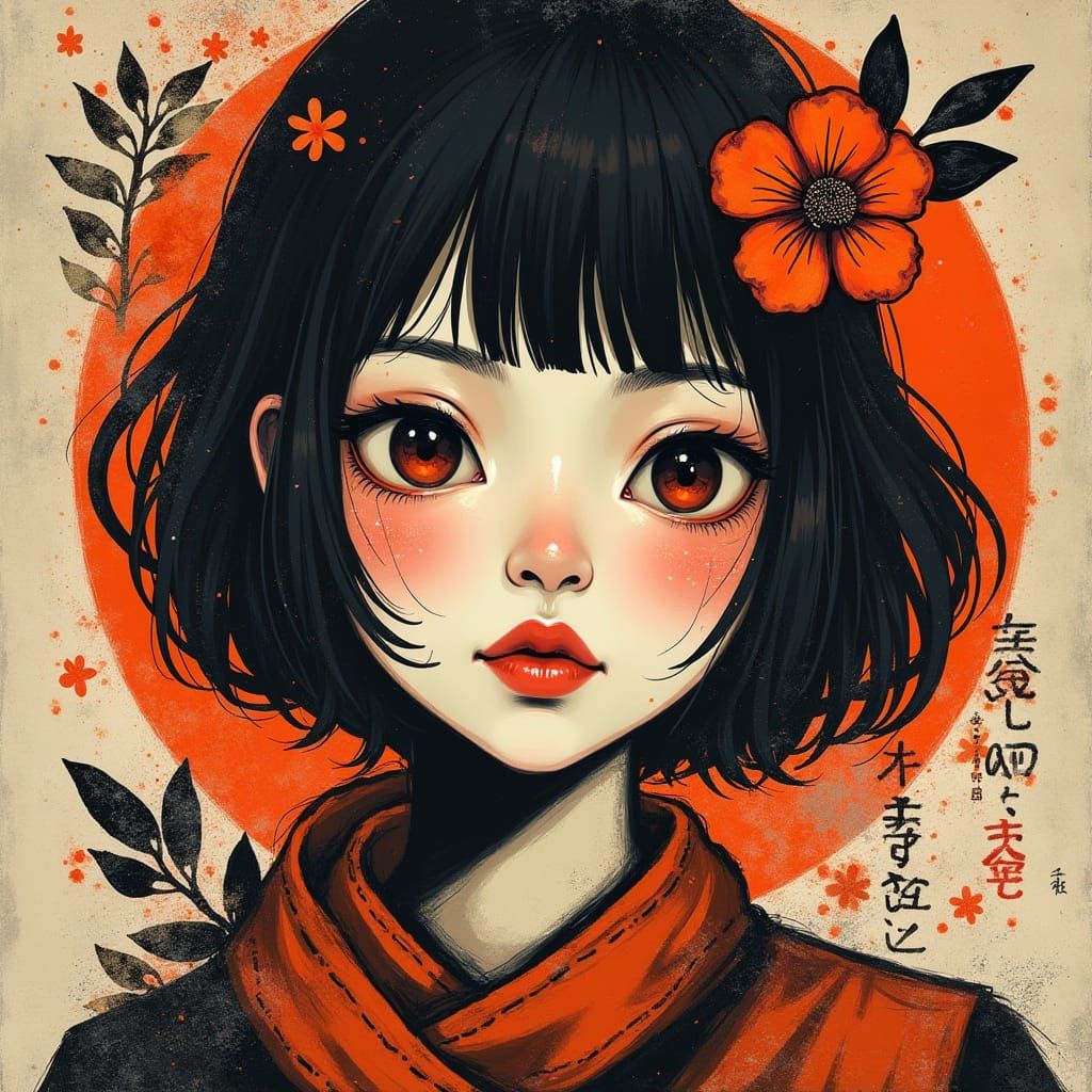 This image showcases a striking Asian woman with a beautiful face, blending traditional Korean culture with a vibrant, abstract urbanpunk aesthetic. Featuring bold black and orange tones, intricate kanji characters, and random graffiti strokes, this surreal artwork embodies the spirit of wabi-sabi and fl...