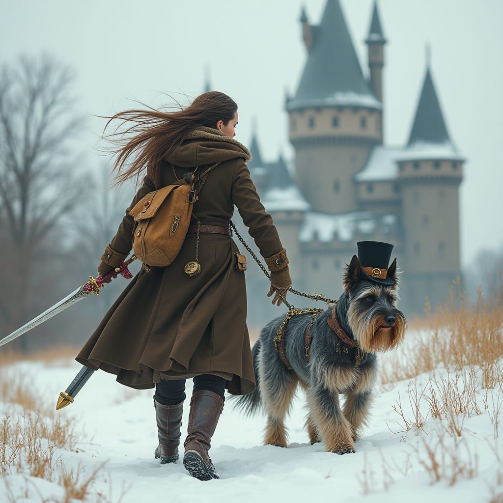 This image shows a long-haired Schnauzer walking with a steampunk girl across a snowy field, with a medieval castle in the background. The artwork features intricate gears and vintage sci-fi elements.