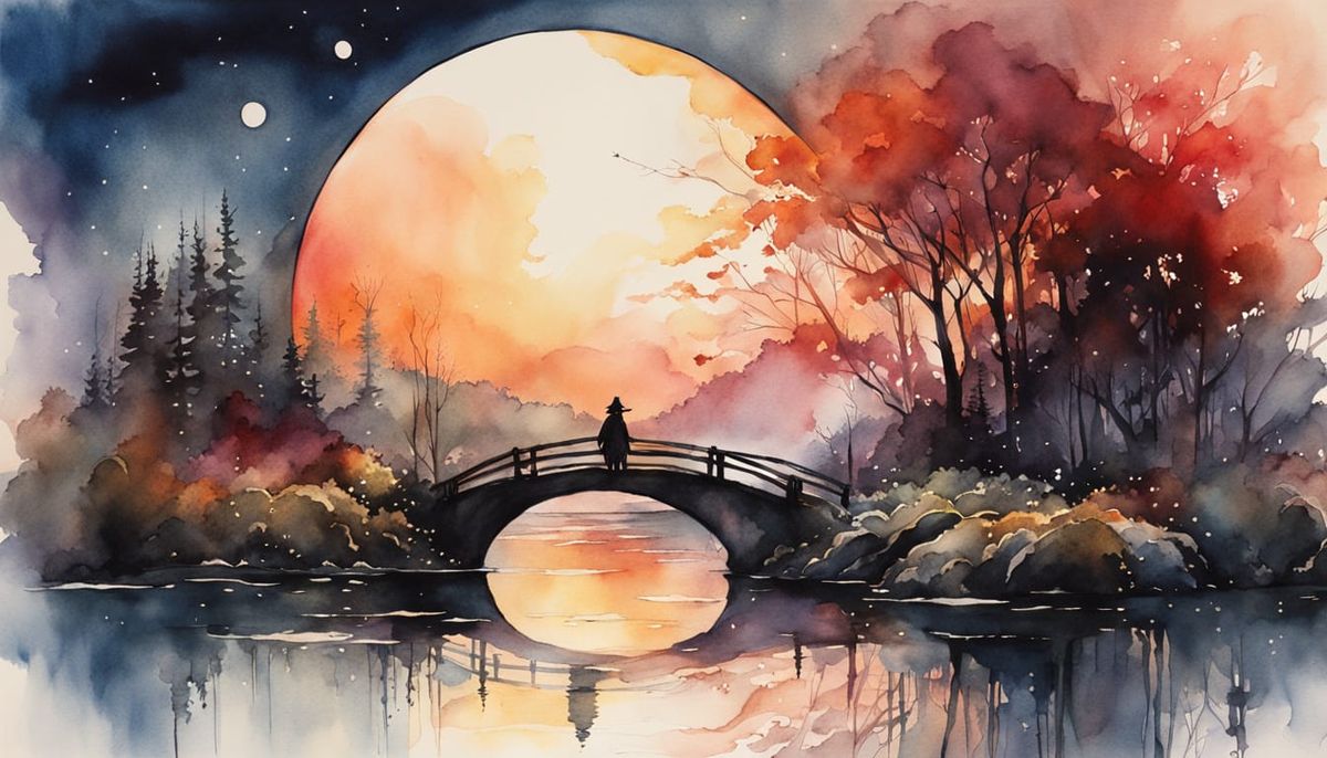 This captivating watercolor illustration depicts a stunning lady standing on a small bridge surrounded by wildflowers, amidst a dark eclipse. Soft, warm light of a red sunrise casts a moody, dreamy atmosphere.