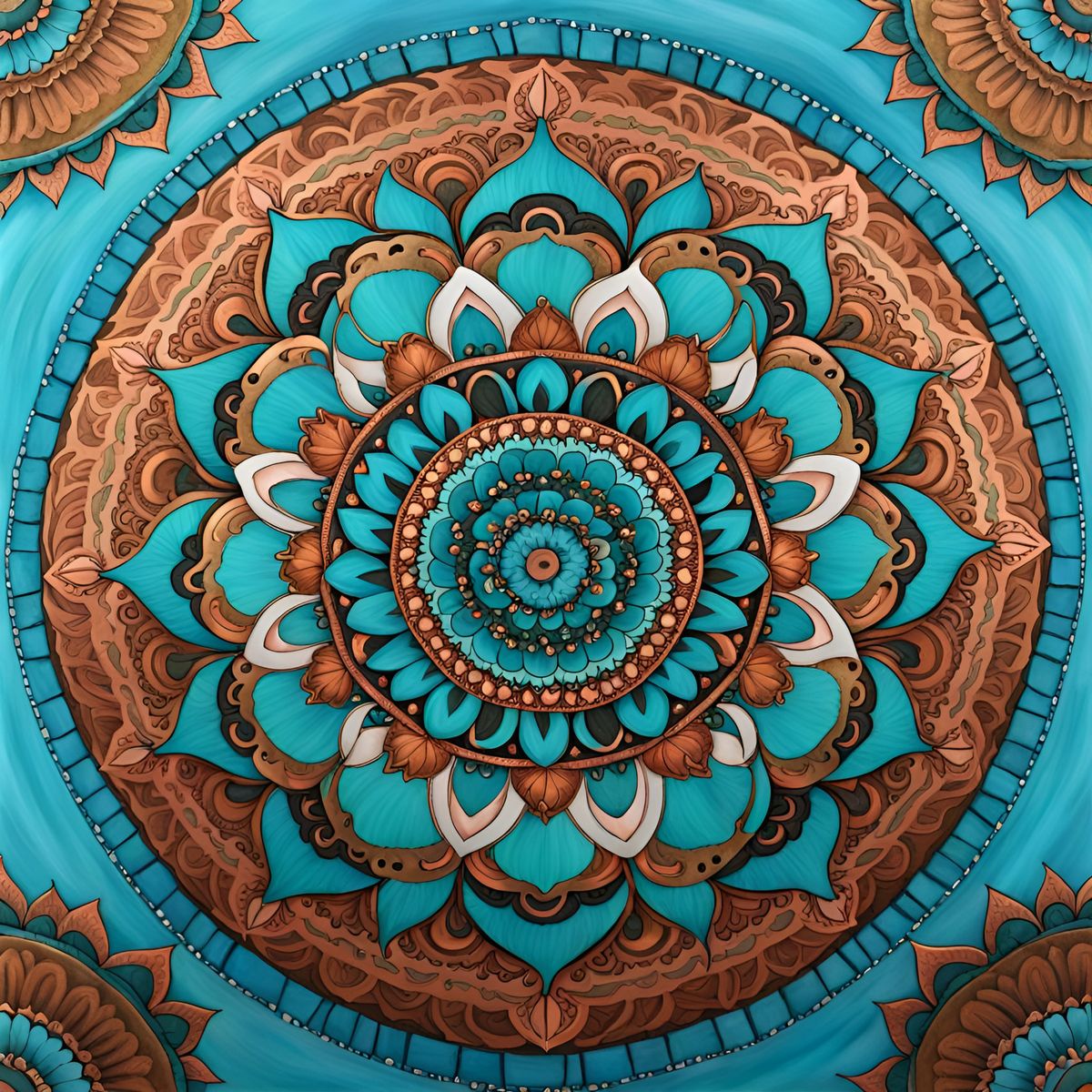 A vibrant mandala featuring turquoise and copper hues. The symmetrical design and contrasting colors create a visually appealing and balanced composition.