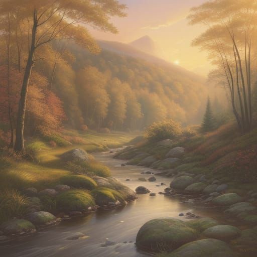 A picturesque landscape featuring a winding river flowing through a forest, leading to a cottage nestled on a rocky hillside. The artwork evokes a serene and idyllic atmosphere with warm light and soft brushstrokes.