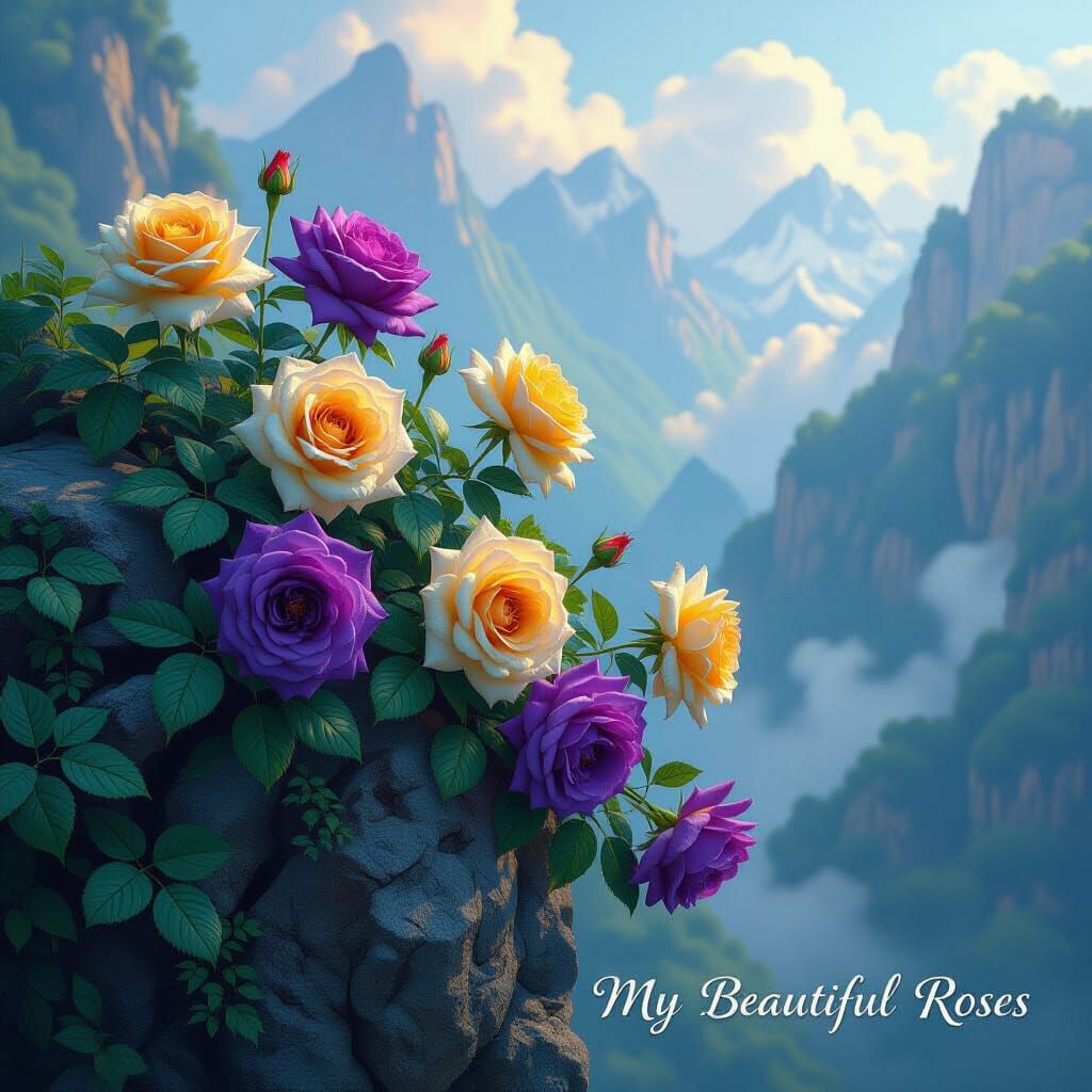 A macro photograph of vibrant purple and yellow roses adorned with water droplets, growing on a rocky cliffside with misty mountains in the background. The image showcases hyper-realistic detail and soft lighting.