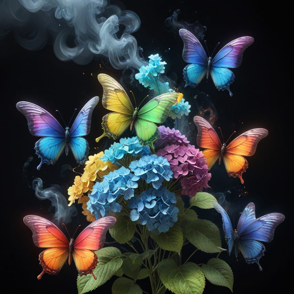 This image features delicate butterflies and hydrangeas formed from highly detailed, glowing rainbow-colored smoke swirls. Rendered in a hyperrealistic 3D style with sharp focus and atmospheric lighting.