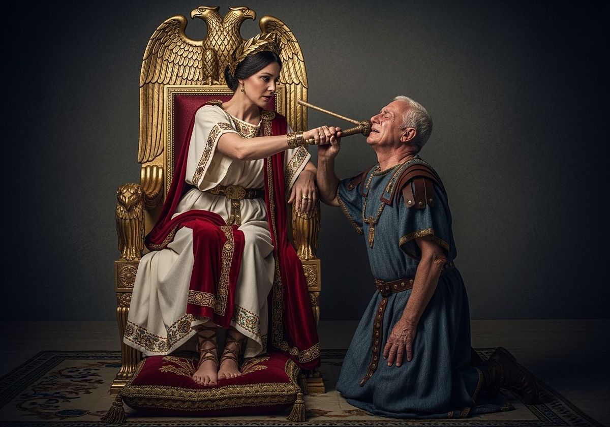 This image shows a Roman Empress in ornate robes seated barefoot on a golden, eagle-shaped throne. An old senator kneels before her as she strikes him. The photograph is professionally styled with a shallow depth of field.