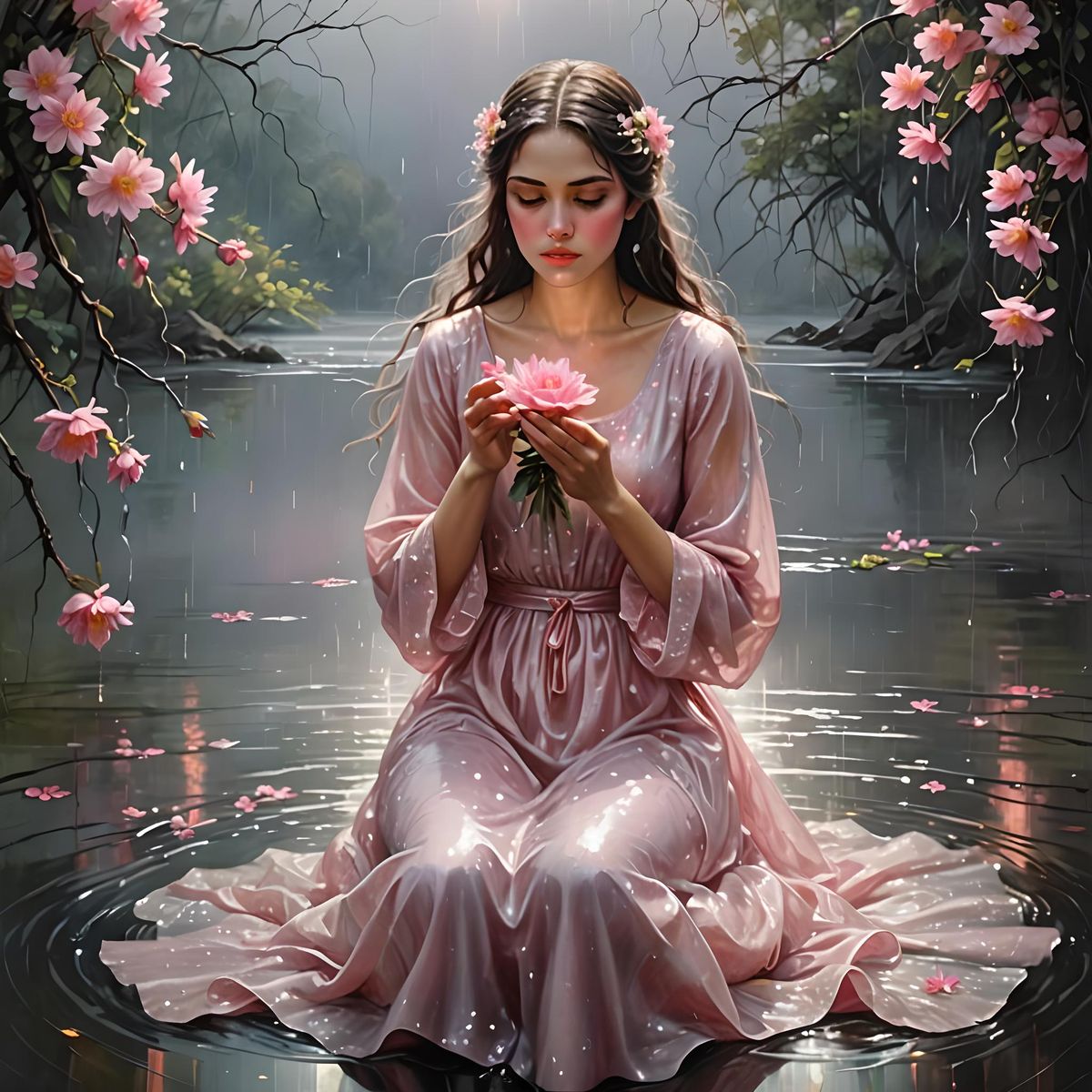 This image shows a beautiful woman in a pastel pink dress, holding glowing flowers by a shimmering lake. The digital artwork, rendered in pastel colors, depicts her in a rainstorm with intricate details.